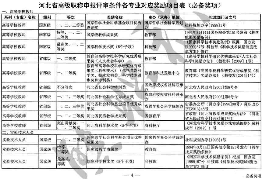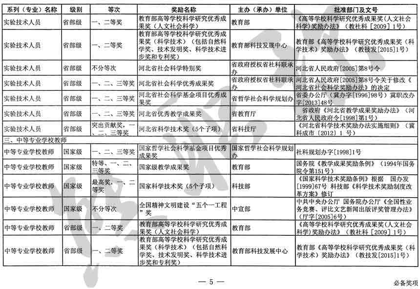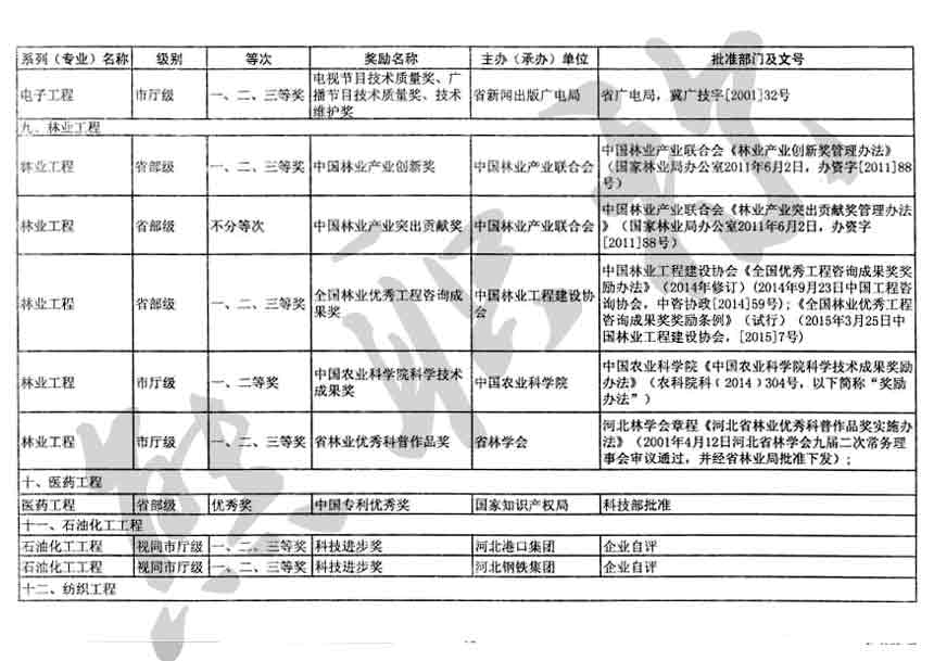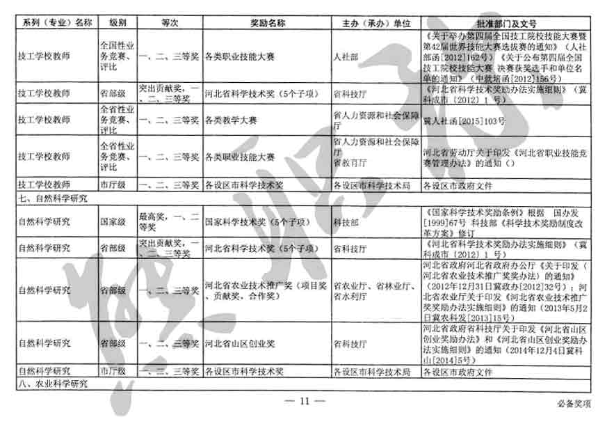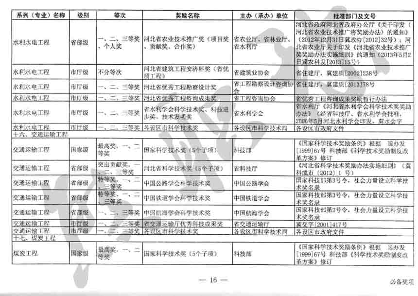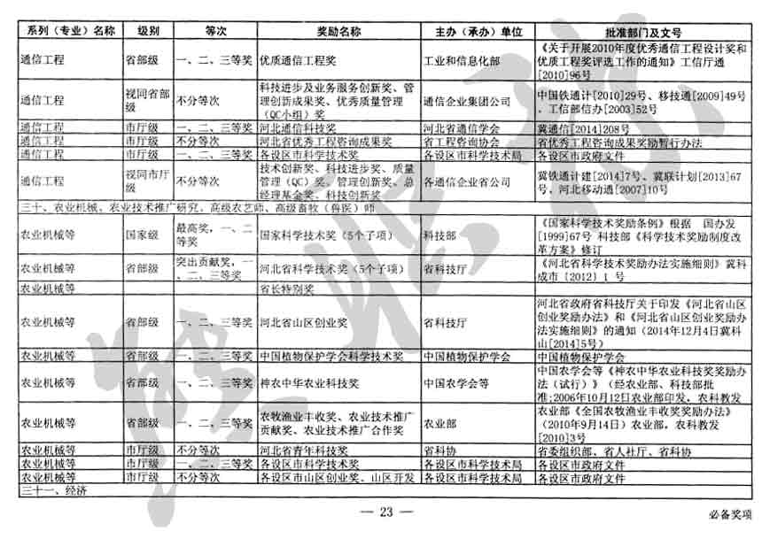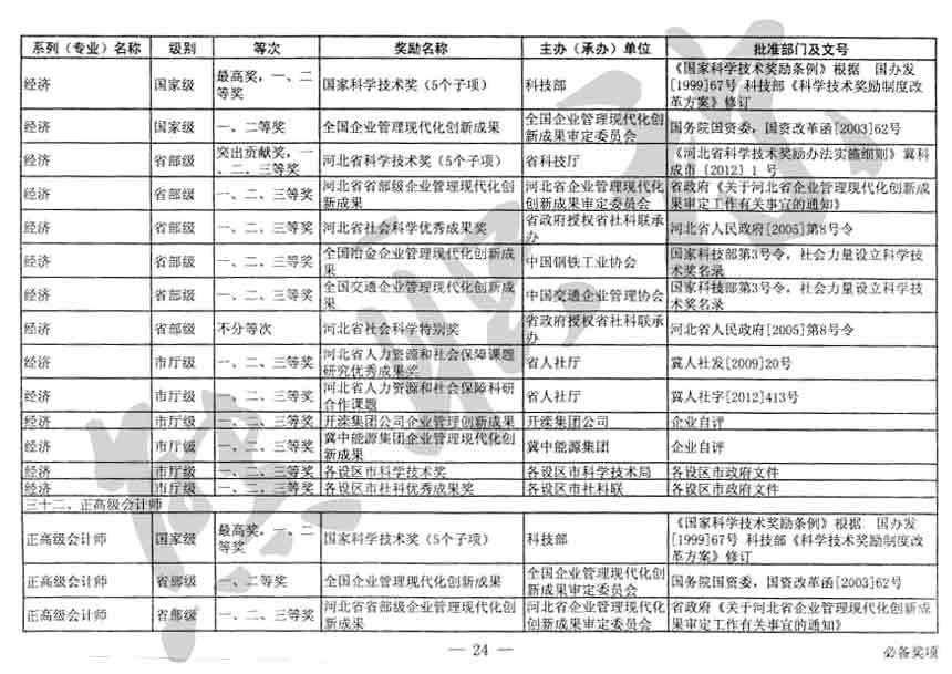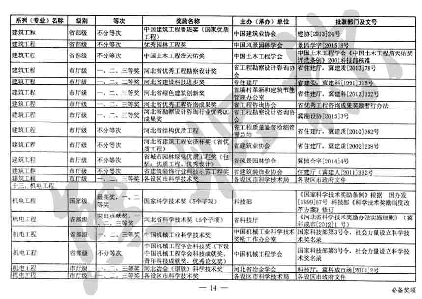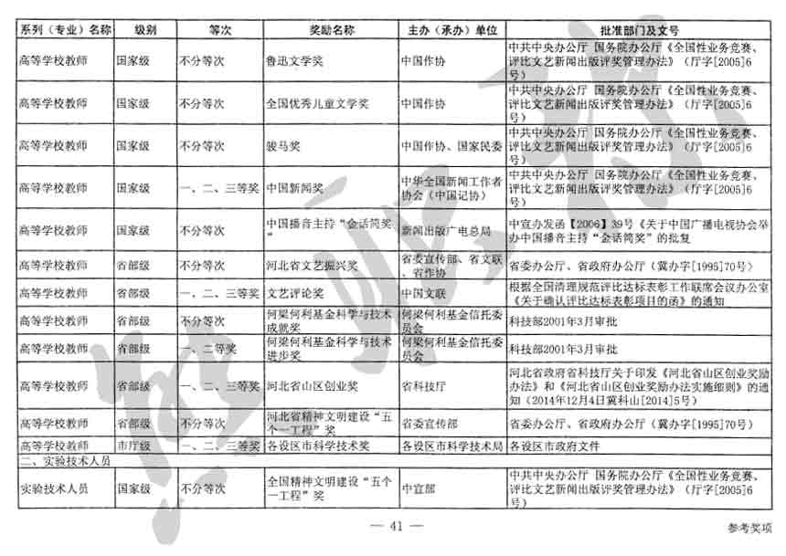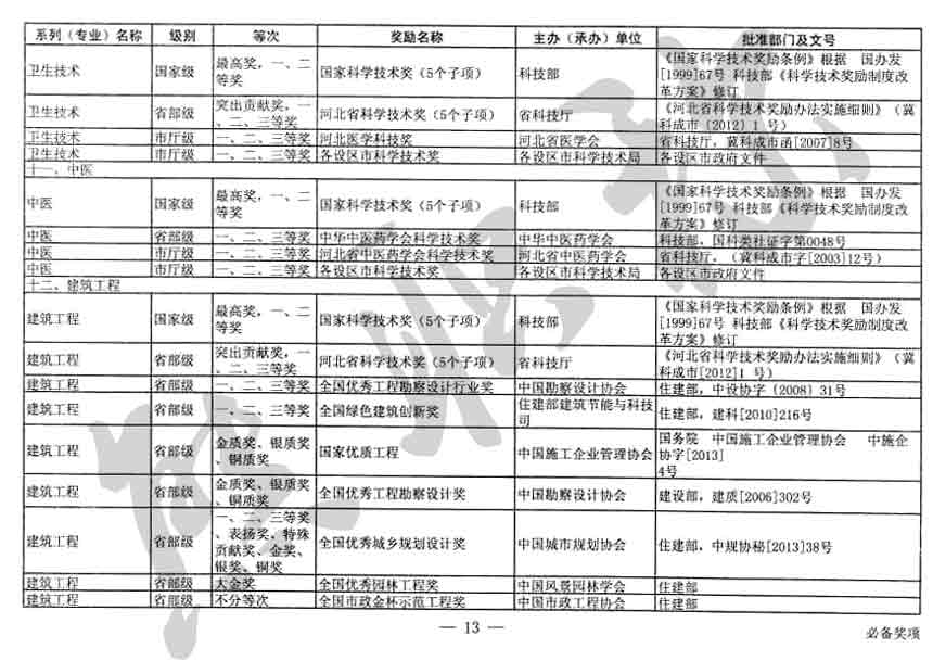 職稱評審業(yè)績成果中包含職稱評審獎項,那么究竟什么是職稱評審獎項,具體各個專業(yè)的河北職稱評審獎項劃分是怎么來的,熊老師今天就把咱們河北省公布過的職稱評審獎勵給您發(fā)一下,人才辦理職稱的時候可以有一個參考,建議收藏,這是一整份, ………