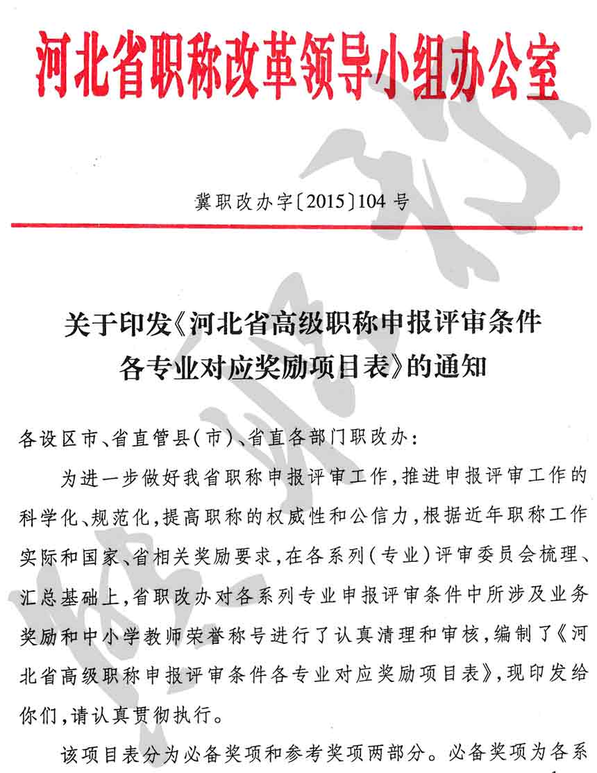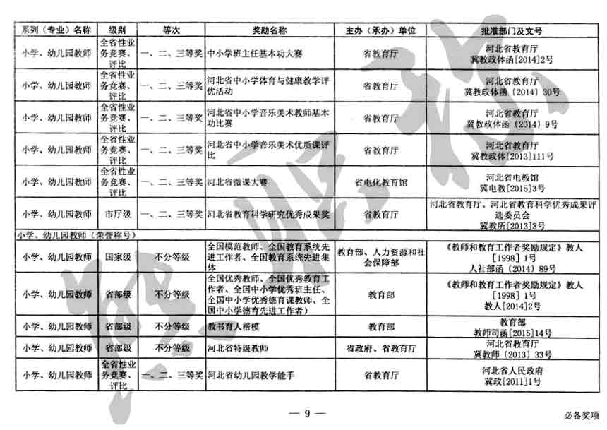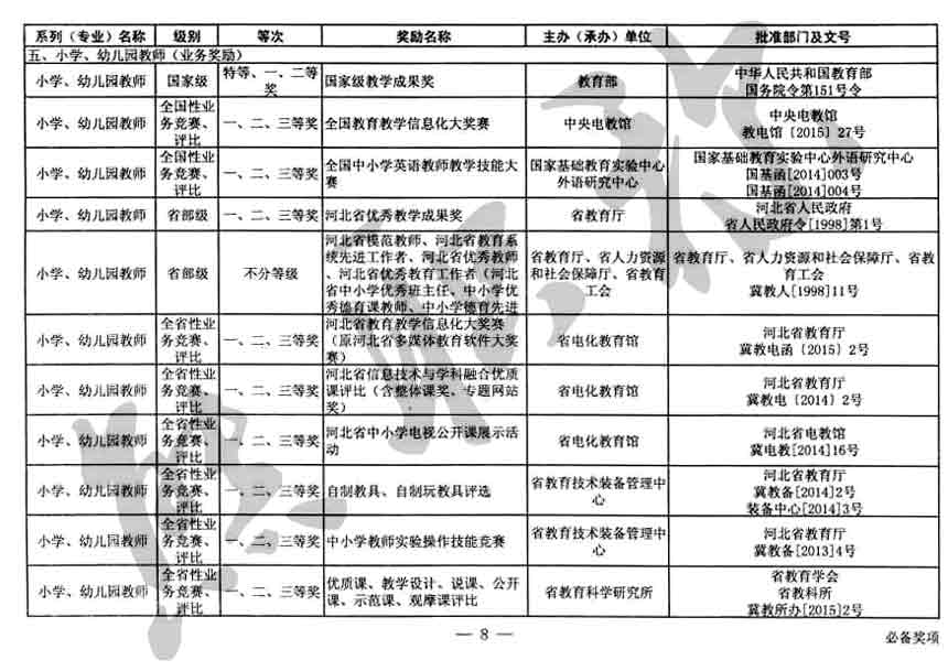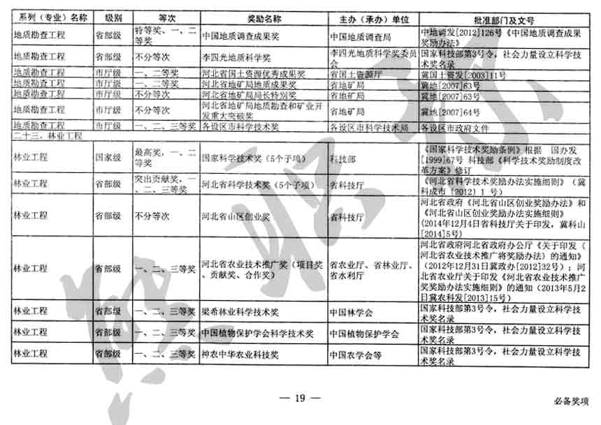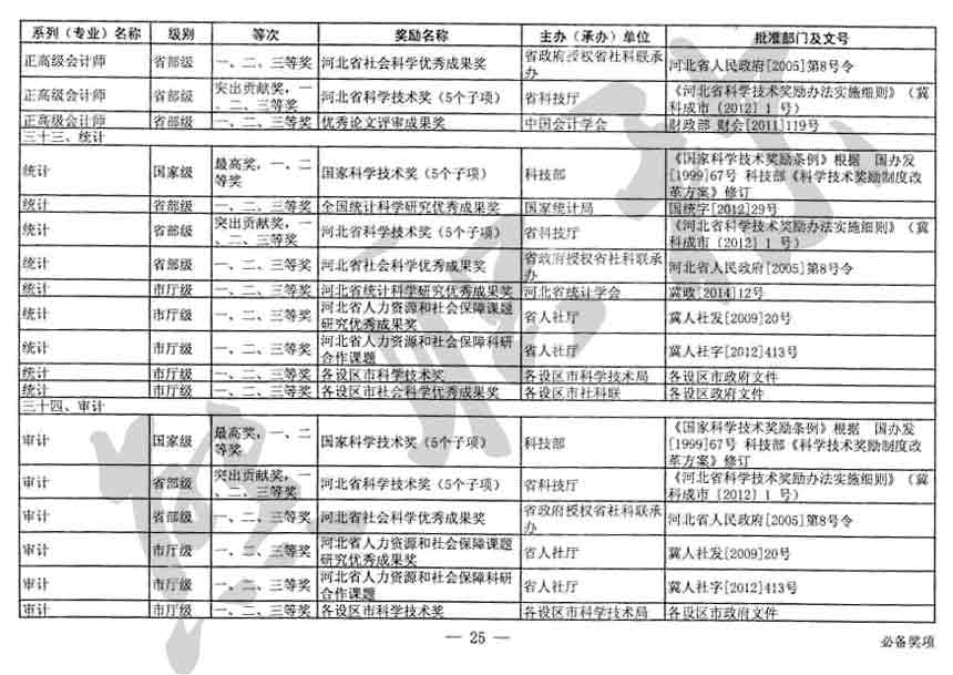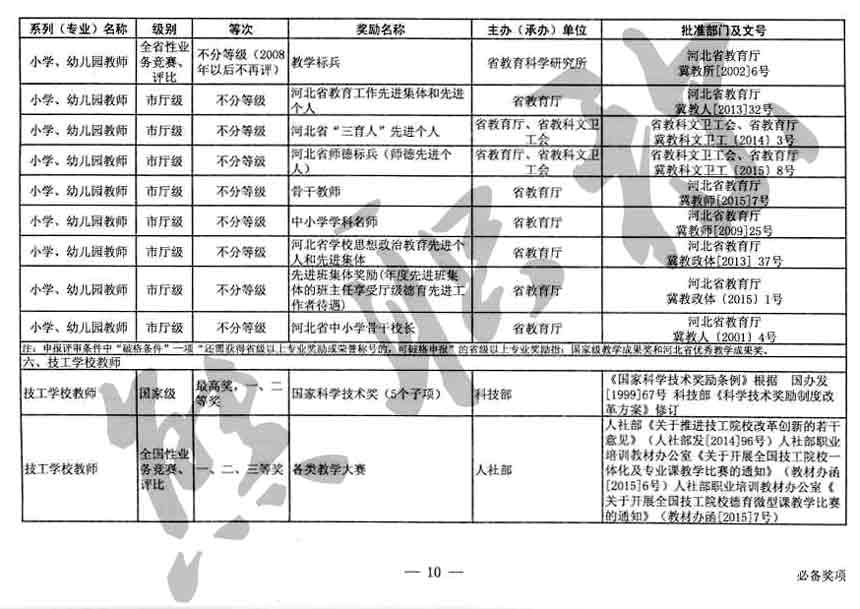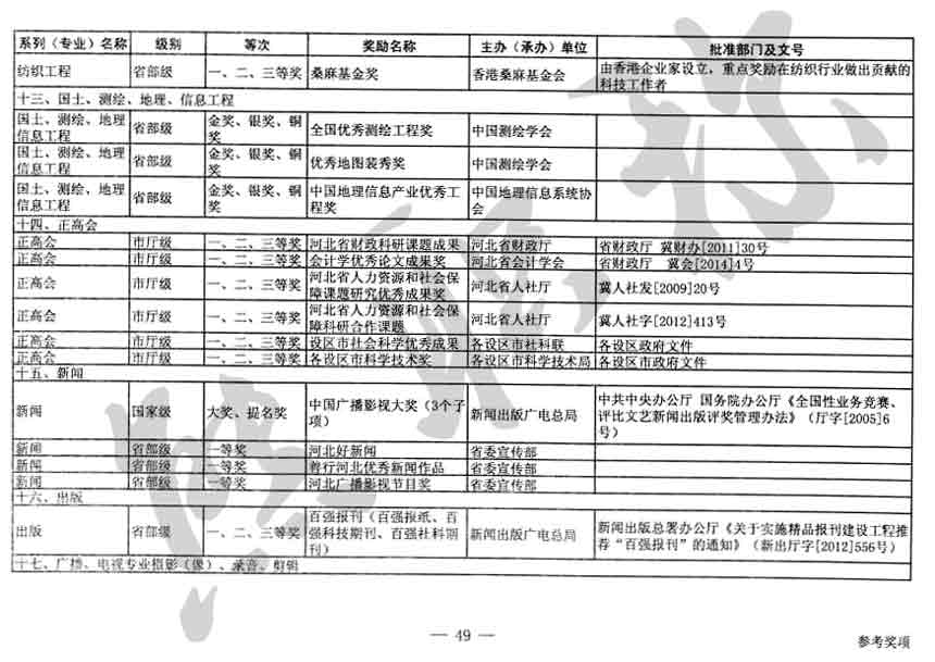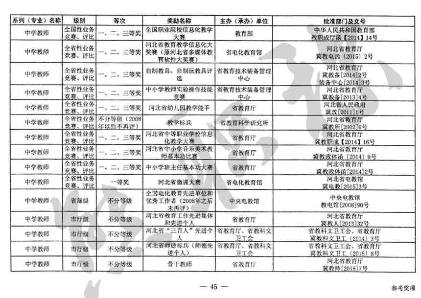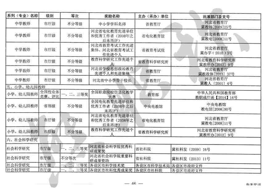 職稱評審業(yè)績成果中包含職稱評審獎項,那么究竟什么是職稱評審獎項,具體各個專業(yè)的河北職稱評審獎項劃分是怎么來的,熊老師今天就把咱們河北省公布過的職稱評審獎勵給您發(fā)一下,人才辦理職稱的時候可以有一個參考,建議收藏,這是一整份, ………